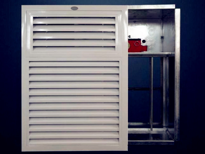 正壓送風(fēng)口作用:當(dāng)發(fā)生火災(zāi)時,其內(nèi)部的電機(jī)會打開風(fēng)口,溫感煙感或者是手動火災(zāi)報警會開啟,塔樓頂正壓風(fēng)機(jī)自動打開,對送風(fēng)豎井進(jìn)行加壓送風(fēng),樓梯的前室通過正壓送風(fēng)口會源源不斷的對前室進(jìn)行送風(fēng),使前室維持正壓,保證煙氣不會再這個區(qū)域蔓延,而給人逃生的空間。當(dāng)溫度高于280°C時人已無逃生可能性,其內(nèi)部熔斷器會熔斷,風(fēng)口自動關(guān)閉,防止火勢蔓延。